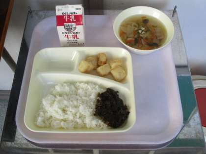 今日の献立は、いかてんぷら、五目汁、のりのつくだ煮です。