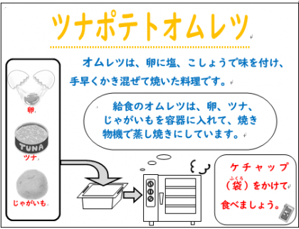 今日の献立は、ツナポテトオムレツ、ケチャップ、スープ、白桃です。