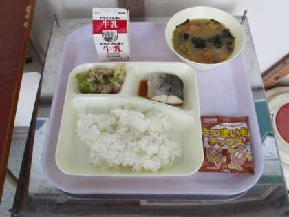 今日の献立は、さごしのしょうゆだれかけ、みそ汁、キャベツの赤じそあえ、おさつチップスです。