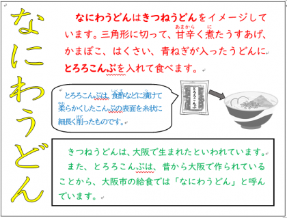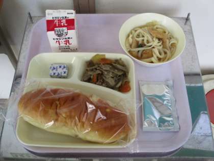 今日の献立は、肉とごぼうの煮もの、なにわうどん、とろろこんぶ、固形チーズです。