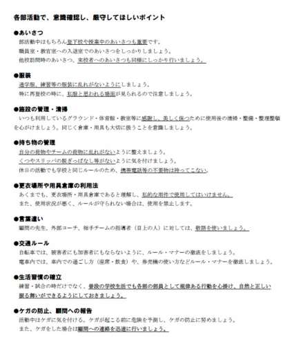 全体会では、あいさつや使用場所の整理整頓を心がけるなど部活動でのルールを確認しました。