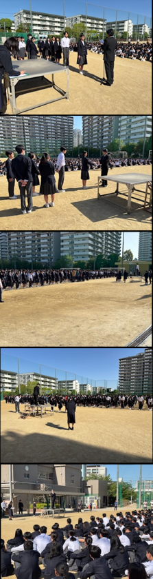 その後、全校集会が行われ、校長先生より、各役員のみなさんは、それぞれの役割を果たして、クラスのため、学年のため、学校のために頑張ってくださいとお話がありました。また、先週の金曜日に部活動編成が行われ、いよいよ本格的に活動がスタートしましたが、同時に気温も上がってきてたいへん暑くなる季節でもありますので、体調の悪いときは無理をせず、水分補給も十分に行ってくださいとお話がありました。