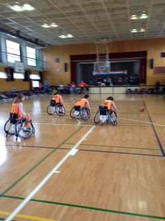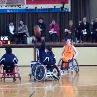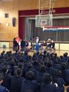 開会式の後、選手の皆様によるデモンストレーションがあり、生徒の車椅子でのシュート体験をしました。