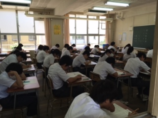 今日は、3年生の第1回実力テストです。1時間目から5時間めまで緊張感が続きます。昼の食事タイムがいつもよりうれしい感じがしました。