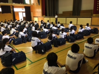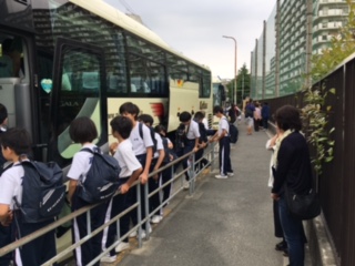 1年生の一泊移住は、出発式で生徒代表が決意表明をして、予定どおりの時間に出発しました。心配していた天候もなんとか持ちそうで、一安心です。