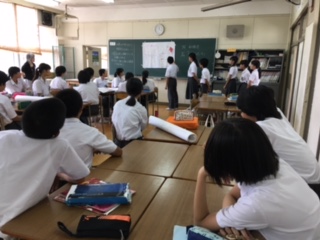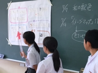 今、2年生の美術では、「和菓子のデザインをしよう」というテーマに取り組んでいます。今日は班に別れて、「和を感じる身近なもの」を探して模造紙にまとめて発表しました。