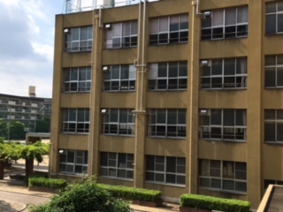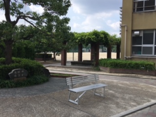 ベンチに哀愁が漂っています。テストの日の午後、普段は部活動の生徒でいっぱいの中庭やグラウンド、教室にだれもおらず寂しそうです。明るい陽射しの中で、学校という感じがしません。土日曜日も部活動で賑やかなので、テストの日の午後、友渕中学校の別の顏です。
