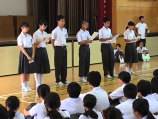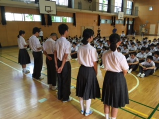 木曜日は2年生の学年集会の日です。今日は2年生の保健委員が熱中症の予防と対応について話をしてくれました。