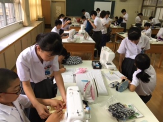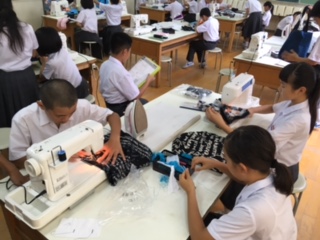 1年生の家庭科の授業では、このひと月ほどかけて、トートバック作りをしてきました。今日は作製最終日です。それぞれが好みの柄の生地で作りました。
