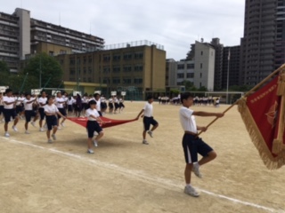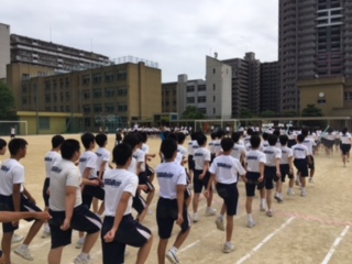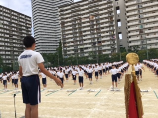 今月22日の体育大会に向けて、午後、3学年揃って全体練習をしました。入場行進、開会式、ラジオ体操、閉会式の練習等。吹奏楽部の生演奏での入場行進は、なかなかの迫力で、今年度初めての練習でしたが緊張感のあるいい感じの練習ができました。体育委員は早朝から打ち合わせや準備など大変でしたが、この過程の一つ一つが力になると信じて頑張ってください!