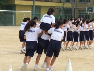 ムカデで一往復の次は、代表が騎馬で走り抜けます。そして最後はボール運び。