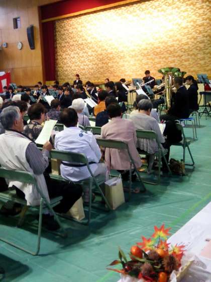 吹奏楽部が第2部に出演し、『ひょっこりひょうたん島』のテーマ音楽の演奏に始まり、唱歌メドレー、『上を向いて歩こう』を演奏しました。演奏に合わせて、ご参加のみなさんで大合唱し、会場内は大いに盛り上がりました。
