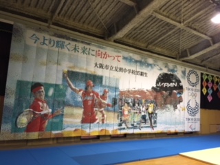 二年生全員で、色紙を貼り付けてモザイクアートを制作しました。二年生、224名。使用した色紙ば36万枚!!12.5m×3.7mです。