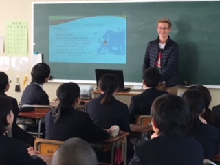 まず、彼は英語も話せるので、英語でドイツの紹介をしてくれました。その後、クラスの生徒から日本や大阪の紹介のお返しをして、日本のジャンケンもしっかり覚えてもらいました〜。