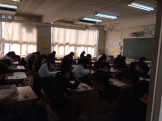 今日、三年生は第3回実力テストです。国語・英語・理科・社会・数学の順で行なっています。いよいよ進路選択も迫ってきている中、教室に緊張感がみなぎっています。