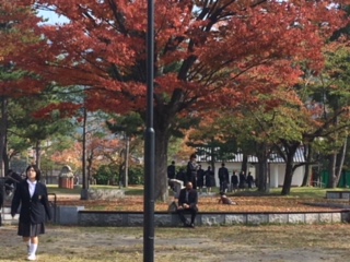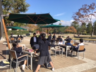 気持ちのいい秋の京都。お弁当を食べたり、貴重な歴史資料に触れて学習したり、芝生の上で遊んだりして楽しんでいます。