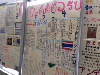 各クラスでは、それぞれのクラスに入っていただく留学生の国について事前に調べて、壁新聞で廊下に貼りだしました。