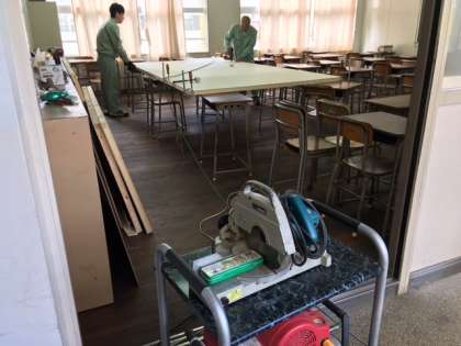 今年度は3年生のフロアーが3階になりました。3階には進路関係のたくさんのポスターを貼る大きな掲示板がなかったので、管理作業員さんに作ってもらうことになりました。
