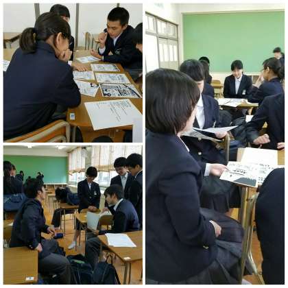 3年生の修学旅行の取り組みは2年生の終わりから始まっています。これは美術の宿題のしおりの表紙の選定の様子です。