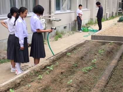 先日お伝えした「はるかのひまわり」は、1年生のひまわり係の人たちが、朝・昼・夕にキッチリと水やりをしてくれているおかげで、順調に育っています。