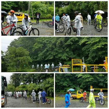 マウンテンバイクは自転車の扱い、乗り方の注意を受けて駐車場で練習後、一列で出発しました。すぐに乗りこなしてました。
