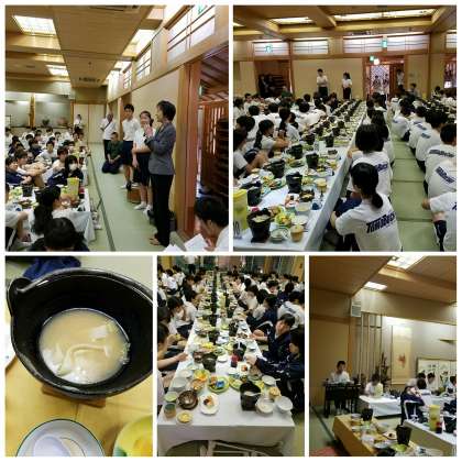 それぞれの自然体験からグループごとに帰ってきてから入浴後夕食です。バラエティーに富んだメニューです。みんなお腹一杯食べていました。