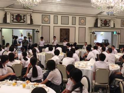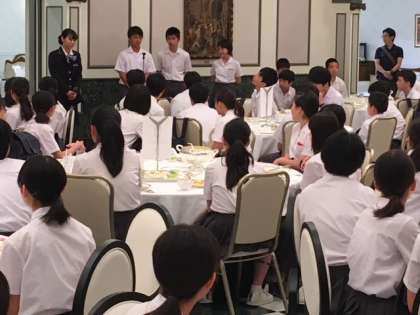 「ご馳走さま〜!」の後、退館式をしました。ホテルの方に、お世話になったお礼を述べます。