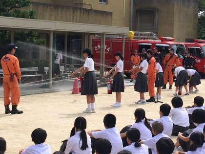 今回は、消防署から来ていただいて、消火器訓練と、消防体験を行いました。