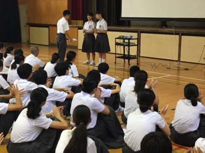 保健委員会から、自分たちで作った資料を使って、「熱中症予防」についての説明をしてくれました。