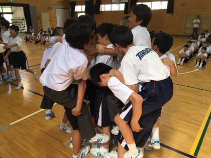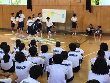 1年は体育館で、6月の一泊移住の夜レクで仕残したゲームを行いました。ダンボールの上に何人乗れるかゲームは、中々の盛り上がりでした!