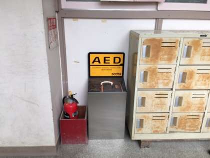 以前お伝えしましたが、友渕中学校では、AEDを保健室前と体育館に2台設置しています。今日、これまで体育館の中に設置していたAEDを、入り口の外に設置し直しました。