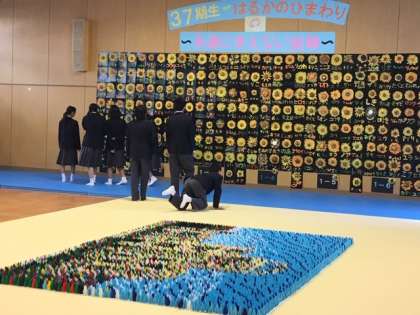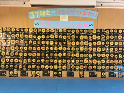 1年は学年全員でちぎり絵の制作をしました。この夏、「はるかのひまわり」の花を育ててたくさんの種を収穫しました。これからいろんなところに種を配ります。私たちは震災を忘れない。友渕中学校が笑顔であふれることを願って作品にしました。