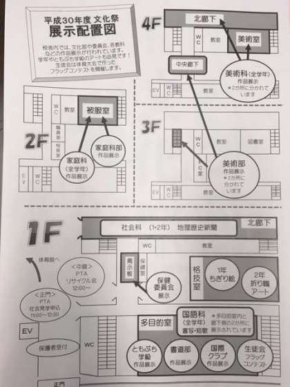 舞台発表は9時から15時の予定です。展示見学は、生徒の昼食時間の11時〜12時30分とさせていただきます。よろしくお願いいたします。