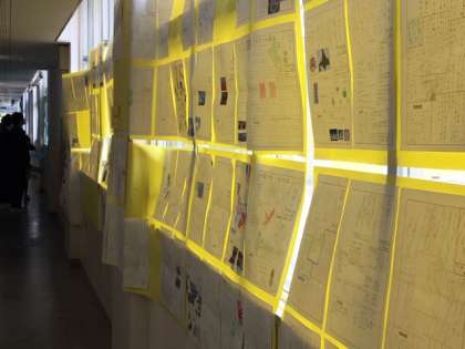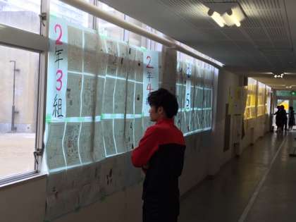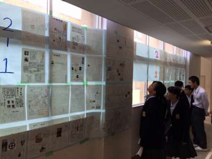 1年生の社会科で取り組んだ「地理新聞」、2年生の社会科で取り組んだ「歴史新聞」を展示しています。
