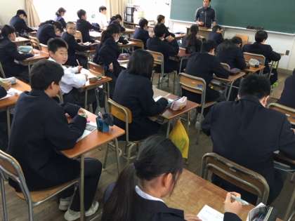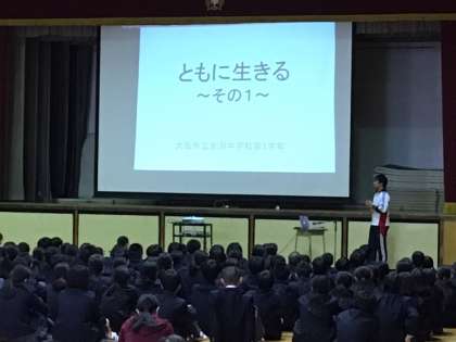 5時間め、1年生は人権教育の「障がい」について学びました。全員で映像を見ながら障がいとは何か、様々な障がいについて、先生に話をしてもらって、具体的に学びました。