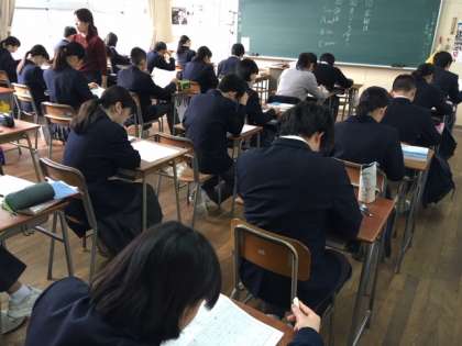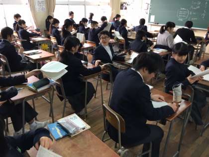文章が完成するまでに、読み合いをして推敲し、それからの回し読みです。文科省の推進する「主体的、対話的で深い学び」の授業ですが、生徒間のコミュニケーションの中で、徐々に自分の考えを深めていくことになります。