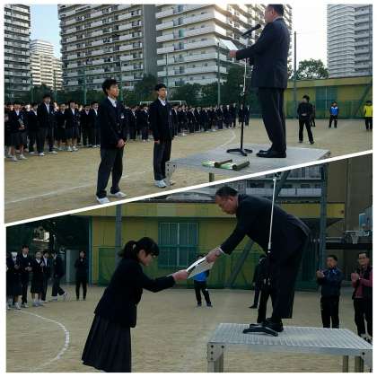 2月18日全校集会の様子です。美術で2年生の課題だった公募展絵画、国土緑化育樹ポスター原画展佳作に入賞した2人が表彰されました。鉛筆とピンバッチの副賞もありました。
