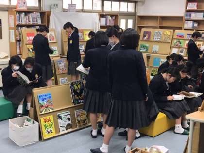 昼休みになった途端に、たくさんの生徒たちが図書館になだれこんできました!絵本にどっぷりと浸っている生徒も多く、この取り組みで絵本の魅力が再発見されたようです。