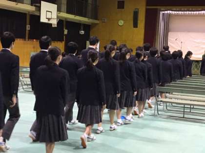 今日から、3年生は卒業に向けた取り組み一色です。今日は卒業式の練習です。まずは入場の練習から。そして、卒業証書を受け取る練習です。