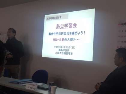 特に大阪市危機管理室防災アドバイザーの方から、友渕の高層マンションの課題として、命を守る為に「家具の固定化」を必ずしてくださいとの話を映像を使って説明されました。