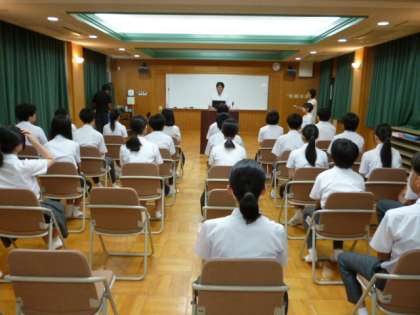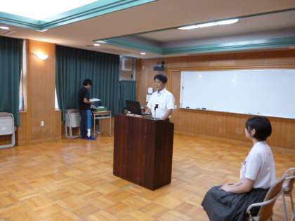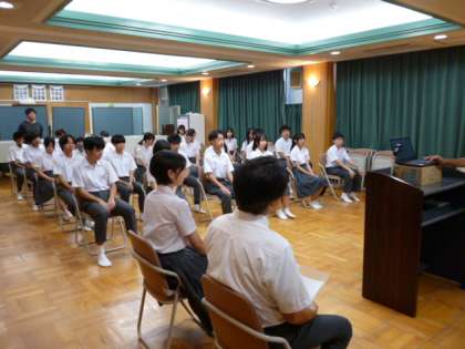 校長から、「今年で戦後80年となり、様々なメディアで戦争について取りあげられています。2年生は8月8日の登校日で原爆について、被害の様子を科学的に学びました。平和な世の中を続けるためには、これまでの歴史を学ぶことが重要です。みなさんが平和について考え、自分たちがお互いをリスペクトできる世の中、集団、友渕中学校になることを期待します。」とお話がありました。