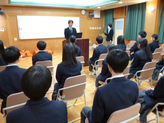 1月8日 Teamsで3学期の始業式を行いました。校長から、「みなさんは、新年をどんな年にしたいでしょうかぁ。午(馬)年は12時である正午の午と書き、12時の正午はエネルギーの最盛期となりますので、活力・情熱を意味します。失敗することもあるかもしれませんが、活力・情熱をもってどんどん新しいことにチャレンジして欲しいと思います。まずは目標を決めて1歩前に踏み出しましょう。」とお話しがありました。始業式終了後に引き続き全校集会が行われ、部活動の表彰と生活指導部からの連絡が行われ終了しました。