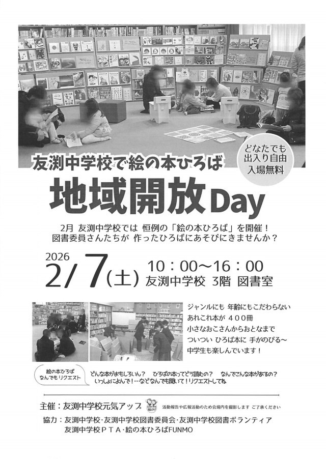 学校図書委員会・元気アップ・図書ボランティアの方が協力し、設営、運営、撤収まで行います。また、2月7日(土)は「絵の本ひろば」地域開放Dayも開催されます。図書委員さんを中心に作ったひろばにあそびにきてみませんか?