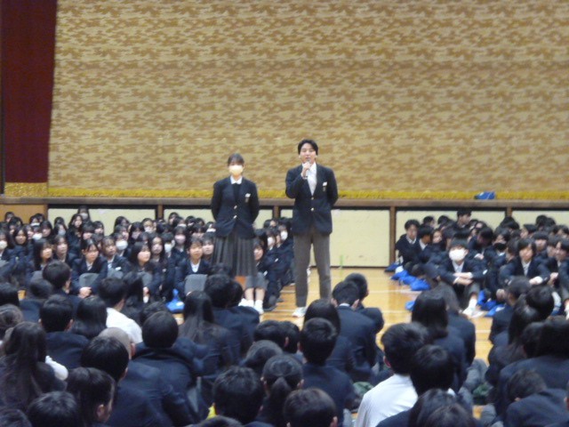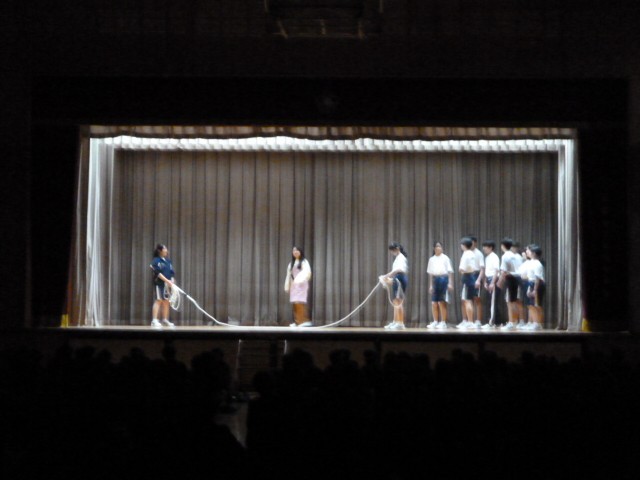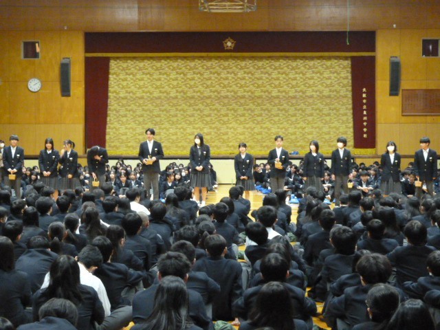 5限目に体育館で3年生を送る会を行いました。始めに色団からのメッセージ動画が再生され、次に2年生委員長と委員会委員長による3年生が過ごした学校生活の行事や起こった出来事を寸劇で表現されました。泊を伴う行事や体育大会などを楽しく振り返えることができました。その後、3年生へのプレゼントとして、1年からしおり、2年生からは卒業式につけるコサージュが贈られました。最後に3年生から感謝を込めて「3月9日」という歌の合唱が行われ終了しました。あと5日で卒業です。中学校生活最後の時間を大切に過ごしてください。