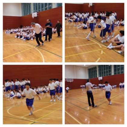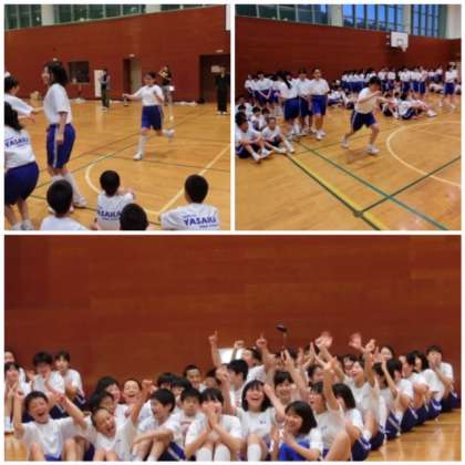 室内レクレーション大会が始まりました。笑顔いっぱいで楽しむ時間です。オープニングは、練習した校歌歌合戦。どのクラスも素晴らしい歌声で、審査にあたった教頭先生は、「一生懸命に歌うようすを見ていたら、とても優劣なんてつけれません!」と嬉しい悩みに困ってしまいました。