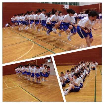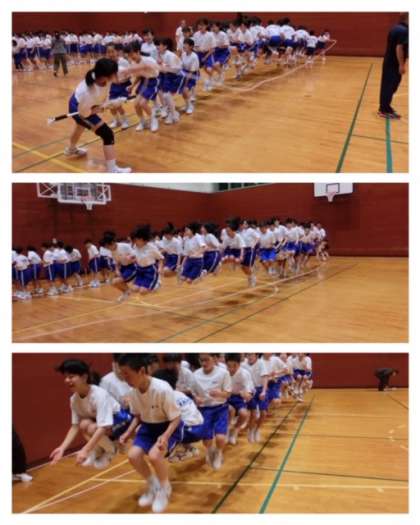 続いては、みんなで練習した大縄とびです。2分の持ち時間で何回跳べるか。さらに2セットめの2分もチャレンジです。練習の時より上手に跳べたクラスがあれば、なかなか成功しないクラスもありました。でも、どのクラスも最後まで一生懸命チャレンジし続けます。30人以上の人数で跳ぶのは思っていたよりずっと難しいです。