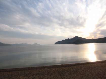 朝の浜辺の風景です。1人も人がいない静謐な風景です。
