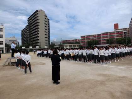 5月20日(月)、朝の全校集会をおこないました。降雨が心配される予報でしたが、青空がのぞく気持ちのよい初夏の朝となりました。全学年とも整然とした集合です。全体行動への意識の高さが伝わります。生徒指導主事の先生から、集合状態について、「1年生は一泊移住での成果を感じる。全学年とも、この高い意識での集団行動を習慣として身につけてほしい。」とのお話がありました。