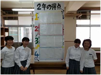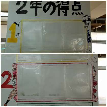 もうすぐ体育大会です。2年生は、24日(金)テスト終了後、女子の学代が得点板を作成しました。ただの得点板かと思いきや、1組にはサッカーボールとPUMAのロゴ、2組には野球のバットとボール、3組にはトランペット、4組にはもちろん、定番のキティちゃんが描かれています。当日は気付きにくいであろう細かいところに、担任への心遣いが感じられる、心優しい4人の学代たちの素敵な“作品”です。本番では、この得点板にどんな数字が掲げられるのか、とても楽しみですね。どのクラスも全力を出し切れるように頑張ってください!