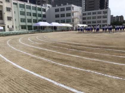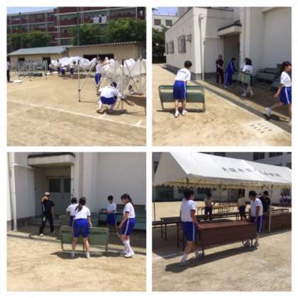 5月30日(木)、午後からは体育大会の会場準備をおこないました。テントを張り、机や長イスを運び、入退場門や得点板など必要な備品を設置します。グラウンドをきれいにならしラインを引きました。吹奏楽部がさいごの確認練習をしています。